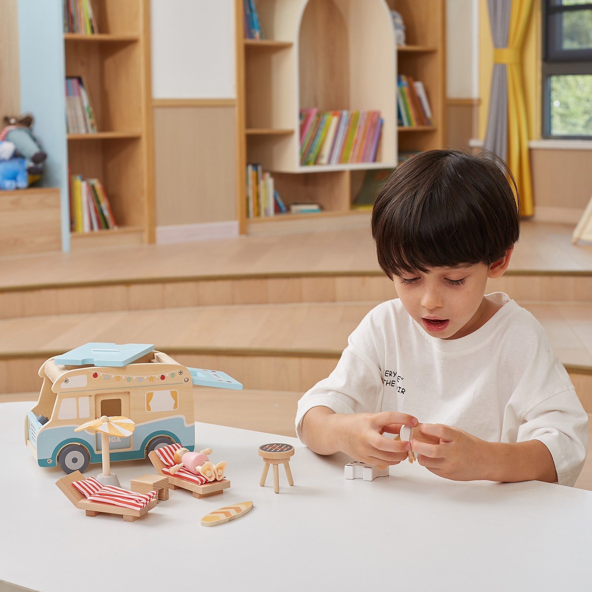 Embark on a fun-filled adventure with our delightful wooden camper van playset. This colourful set features a beautifully crafted camper van with detailed designs and a surfboard attached to the side, capturing the essence of a classic road trip.