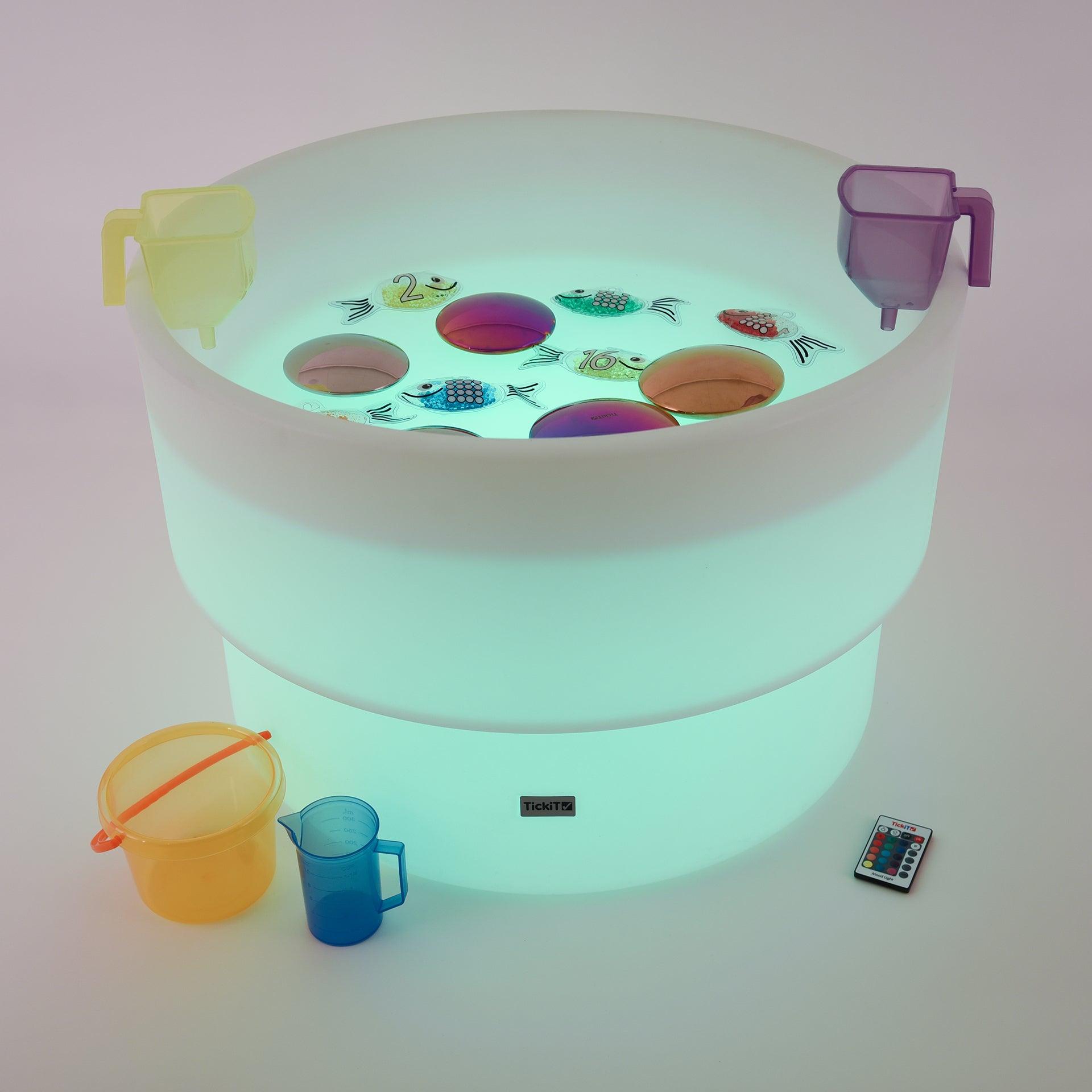 The slim profile makes it easy to move between rooms and the sturdy but lightweight design makes it practical to alternate between indoor and outdoor play. Like all tickit® Sensory Glow Lights, the water table is easy to wipe clean. It provides a great environment for collaborative play, and the height is designed for easy access to the contents for children. The sides and bottom of the internal well have been carefully crafted to make it easier to cover the base with only a small amount of liquid or other materials if required.