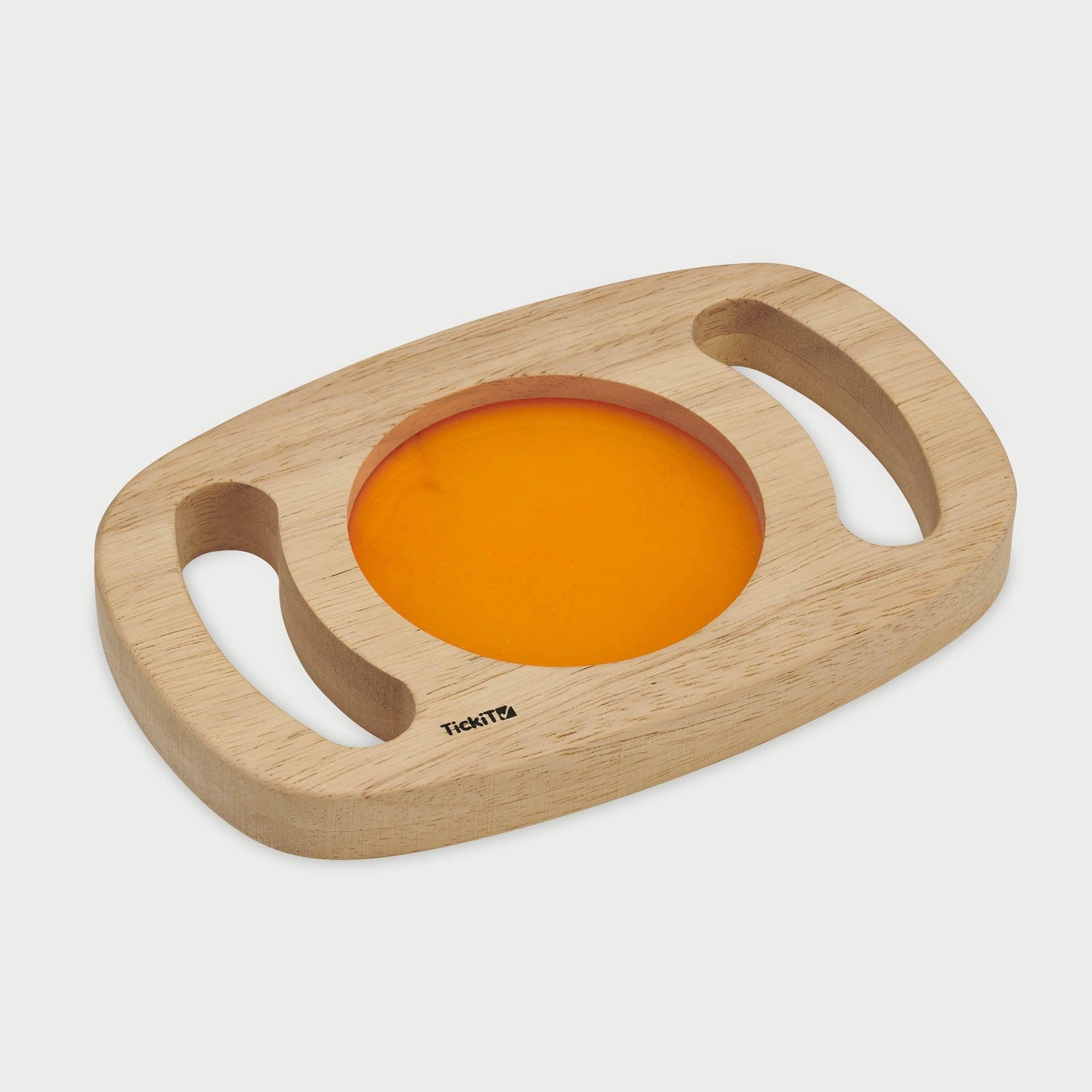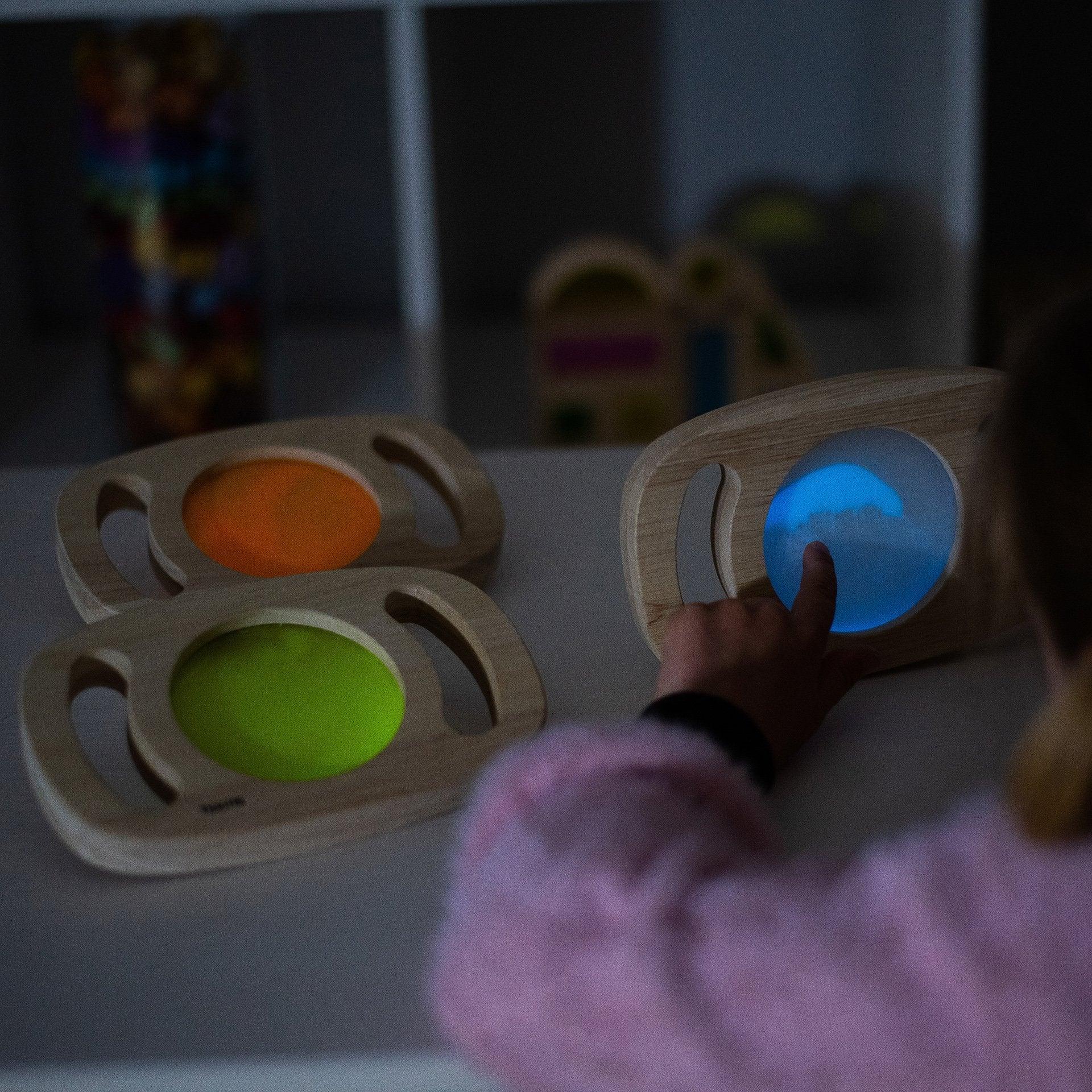 tickit® Easy Hold Glow Panels have solid rubberwood frames with easy to hold handles, enclosing different colourful glow-in-the-dark inserts that will fascinate your child and help them engage with the world around them in a unique way. The luminescent orange, blue or green panels offer a new magical, vibrant and sensory perspective of their environment, and when turned and twisted the glowing liquid swirls to create captivating movement. Perfect for sensory discovery and encouraging descriptive vocabulary.The panels are activated by leaving them in sunlight or bright light for 15 minutes and will glow for up to 6 hours.