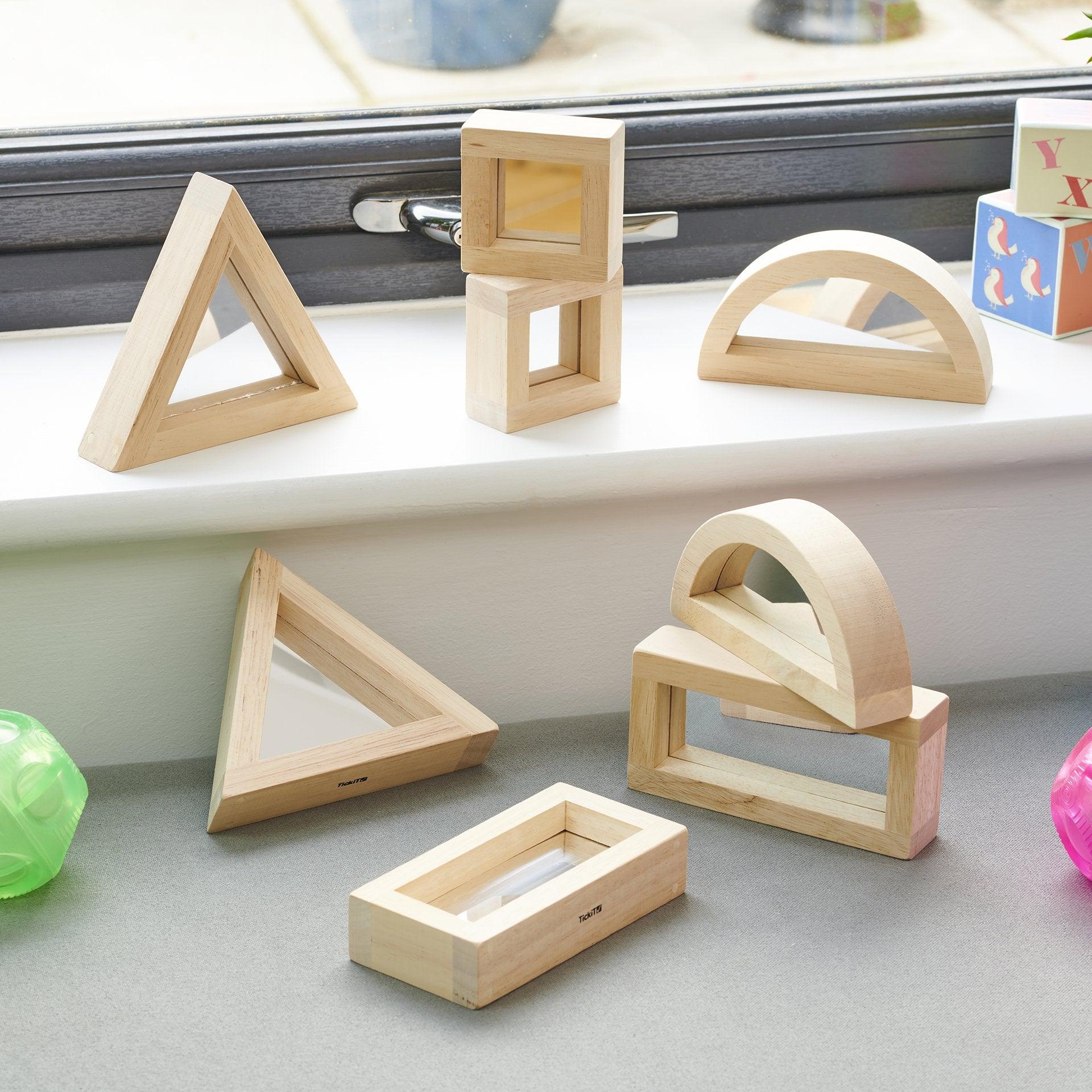 tickit® Large Mirror Blocks are different shaped rubberwood blocks containing a double-sided acrylic mirror centre. Smooth and tactile, your child will love exploring their reflection, be captivated by the light reflection from the mirrored surface and enjoy simple block building. Ideal for learning about shapes and reflective pattern making. The blocks are the same size as our Sensory Block Set which can be used in combination with this set.
