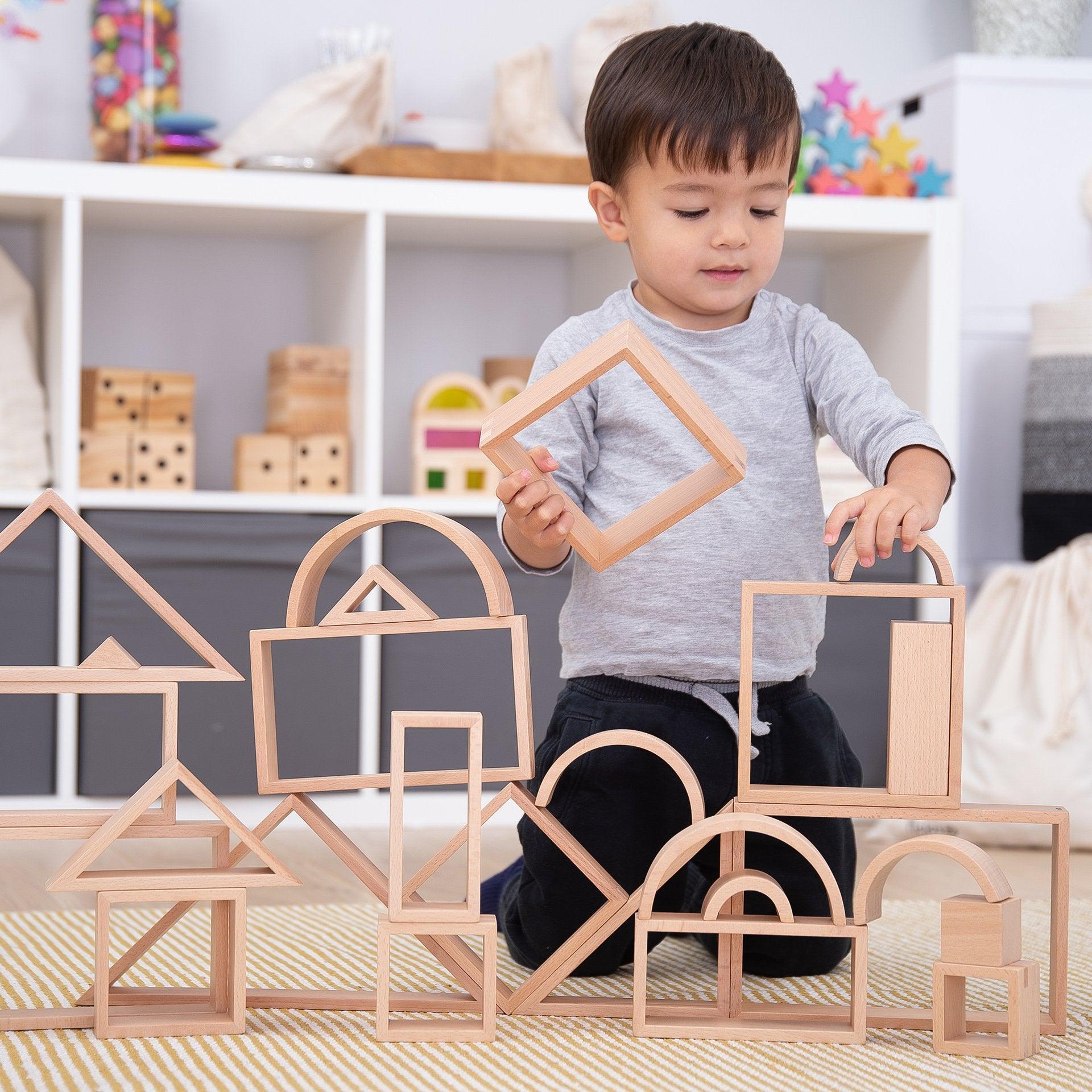 Made from beautiful smooth solid beechwood with a natural woodgrain finish, these shape sets will allow your child to unlock their creativity and innovation.
