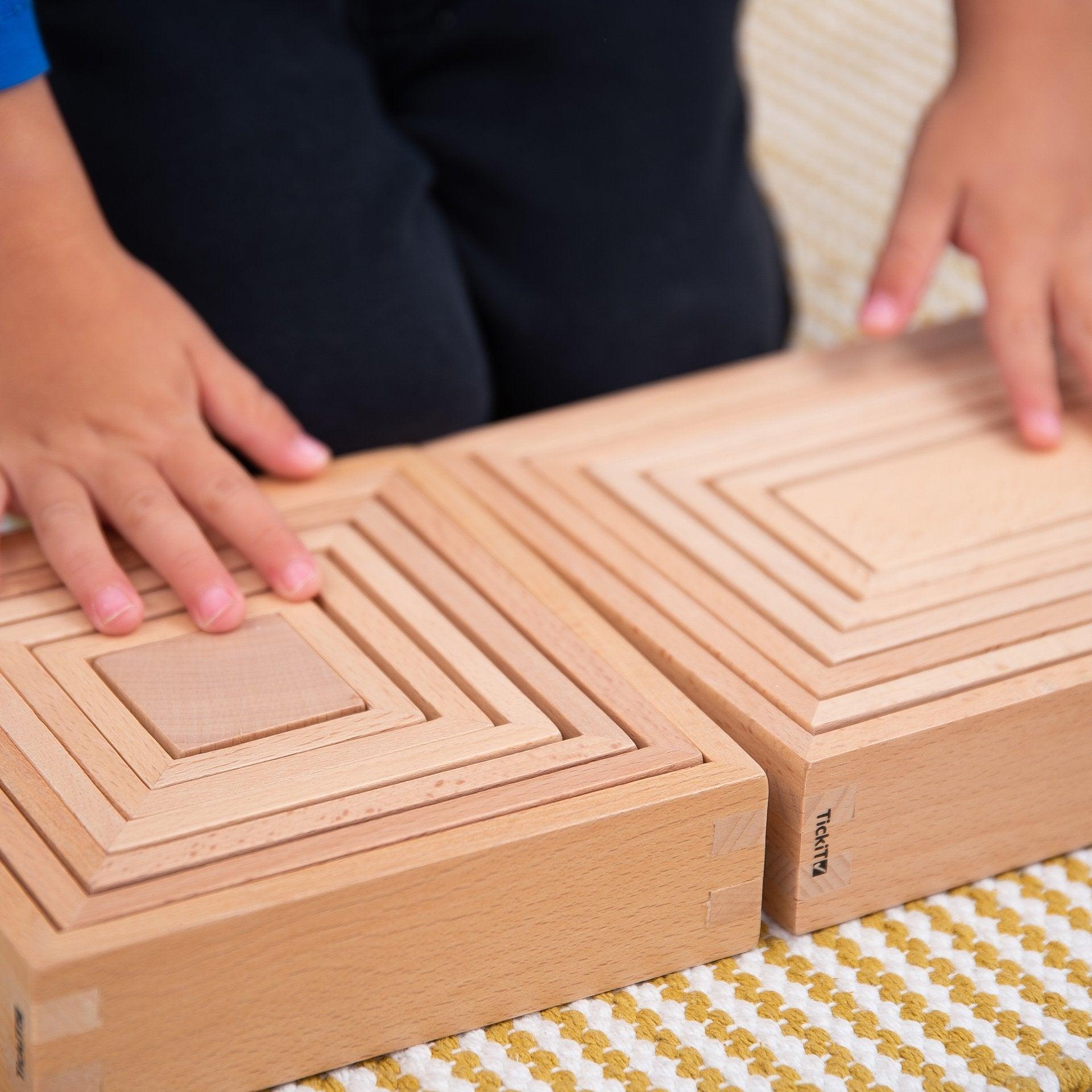 Does your child love to build and construct fascinating towers and structures? Then they will love our tickit® Natural Architect Set consisting of 4 geometric shapes (squares, rectangles, triangles, arches) nested together with the inner block in each nesting group being a solid 3D shape.