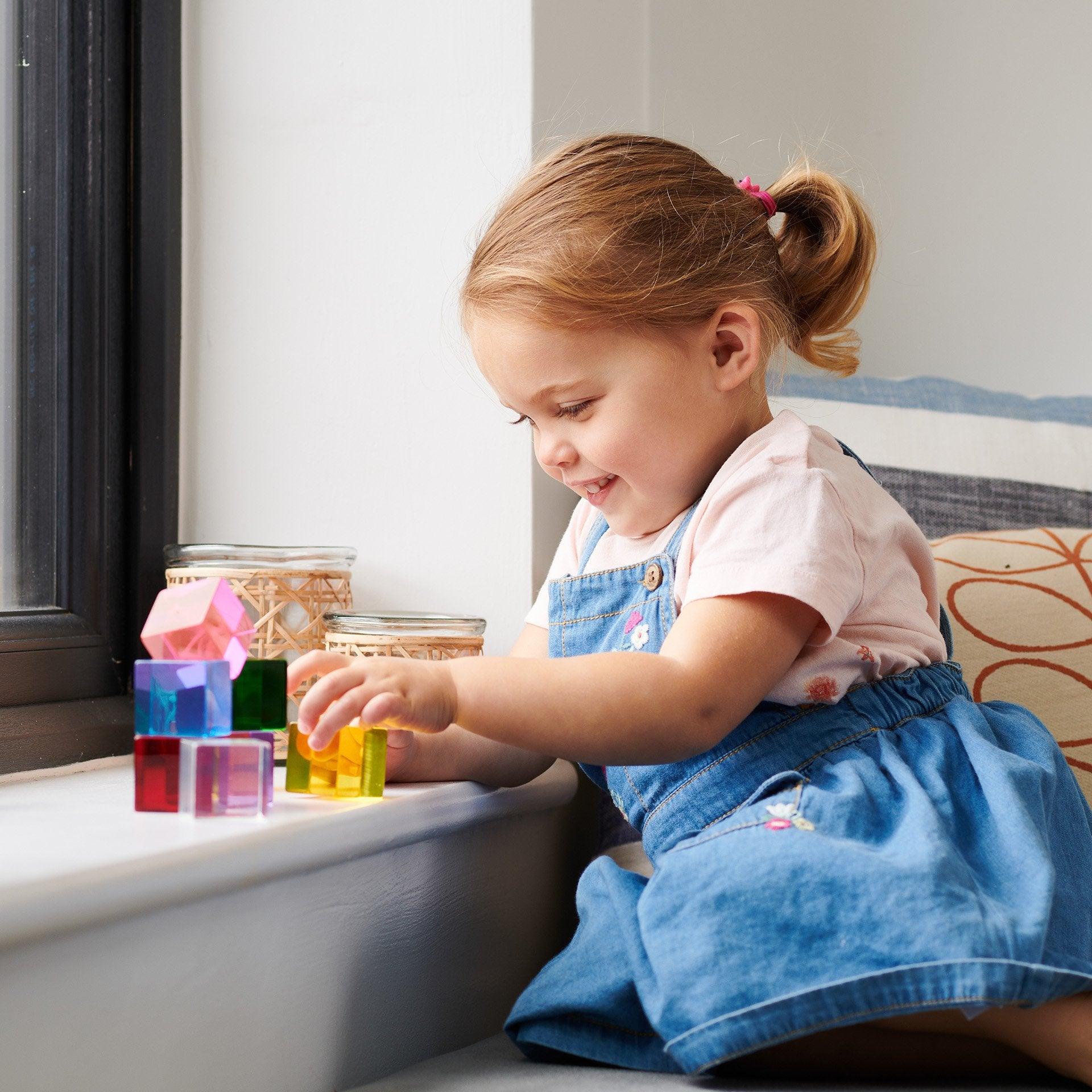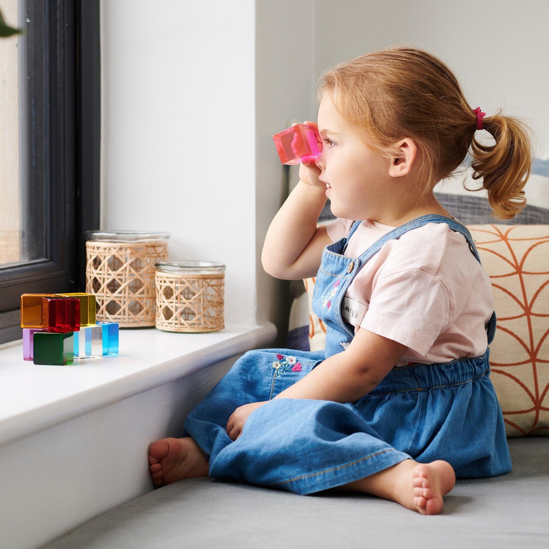 Holding two or more cubes together will create new colour combinations and hues; whilst using the cubes on a light panel or against a window to capture natural light will exaggerate and enhance the magic of colour mixing.