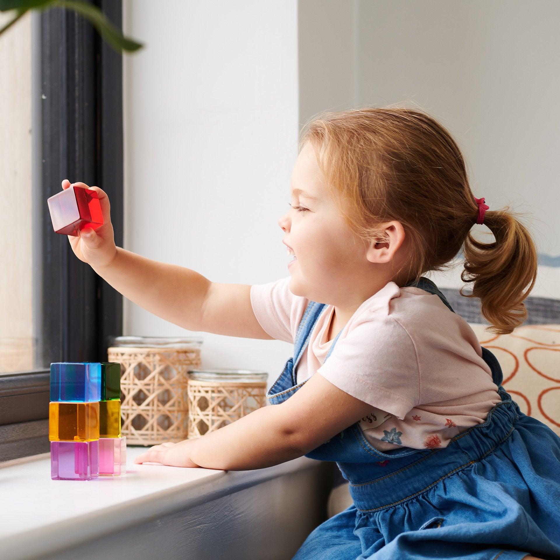 Children can stack the cubes to form towers or incorporate them with other materials and resources to create small world settings.