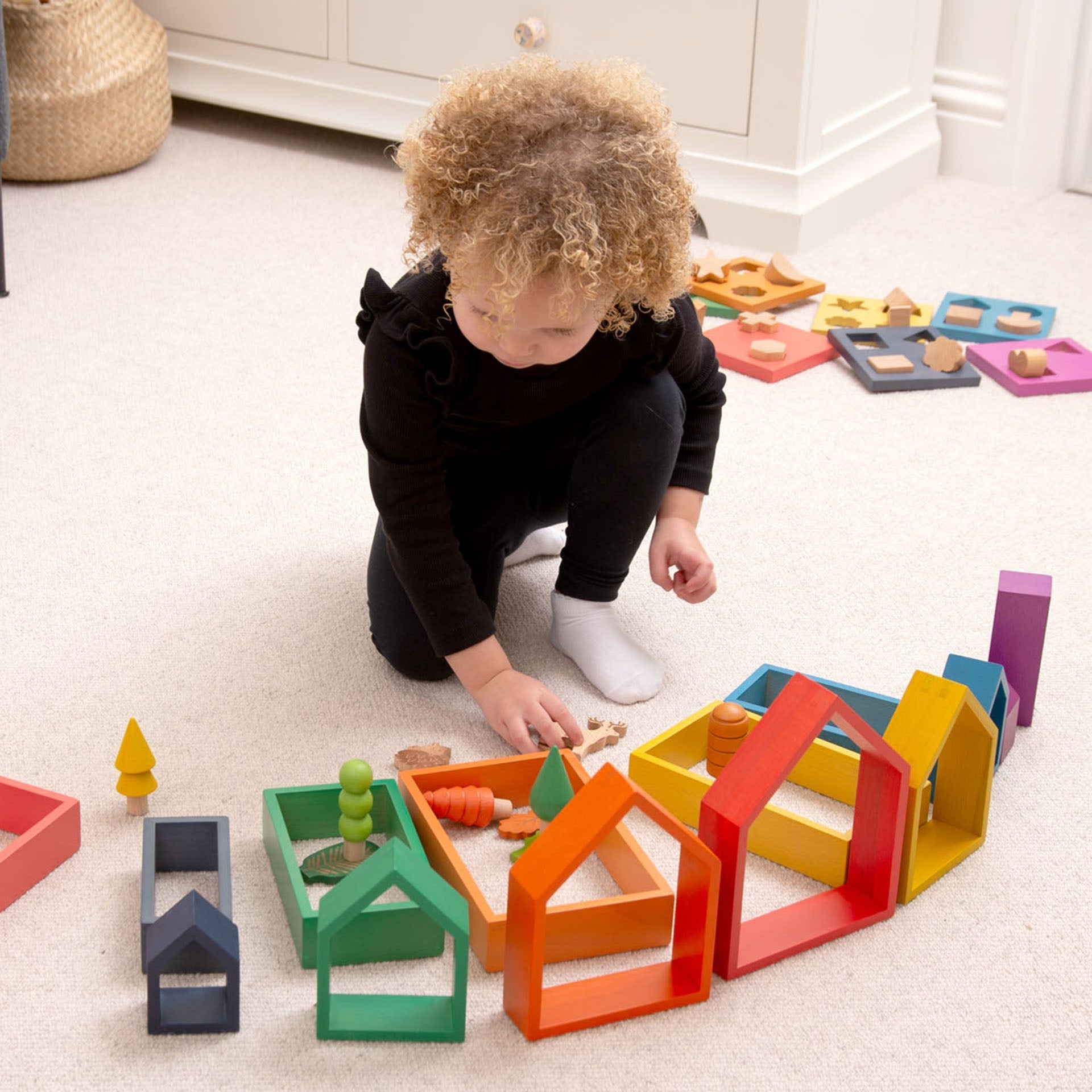 Our tickit® Rainbow Architect Houses are made from beautiful smooth solid beechwood with a natural woodgrain finish in the 7 different colours of the rainbow. The houses nest together as a set with the inner block being a solid 3D shape. This shape set will allow your child to unlock their creativity and innovation.