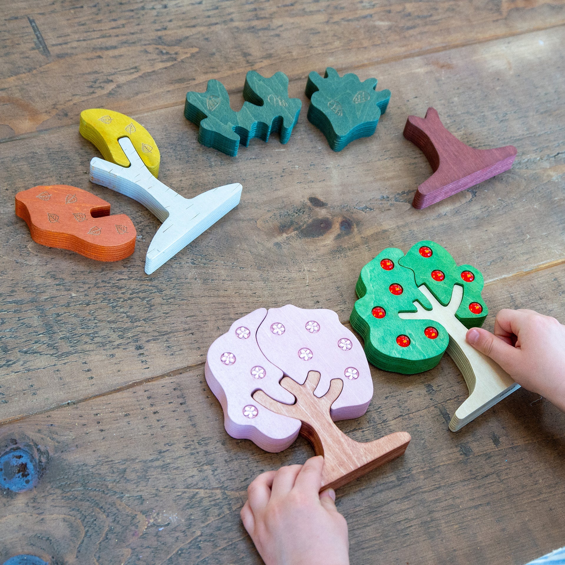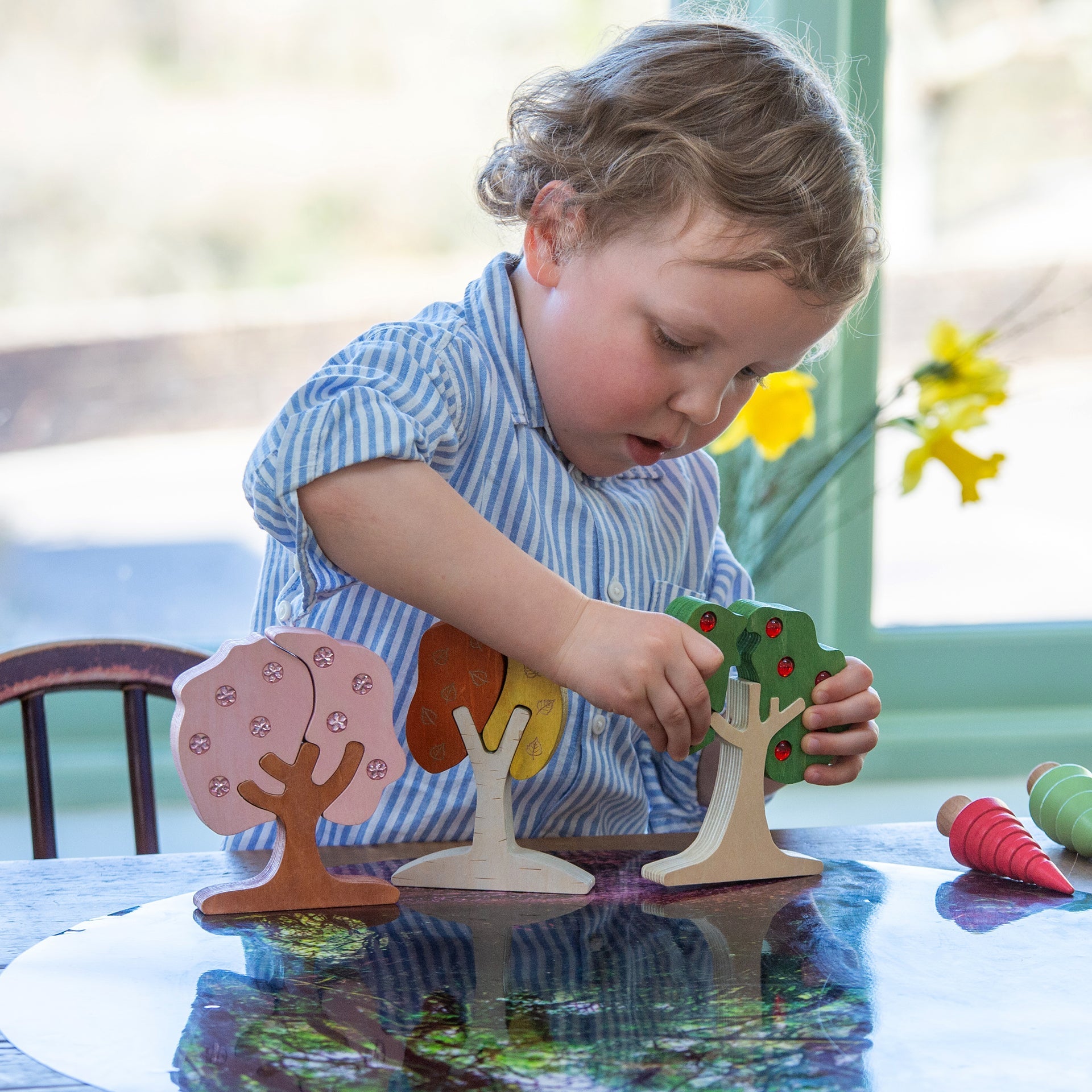 Explore the changing seasons with this beautiful set of chunky wooden trees, each representing a different time of year—evergreen for winter, cherry blossom for spring, apple for summer, and silver birch for autumn.