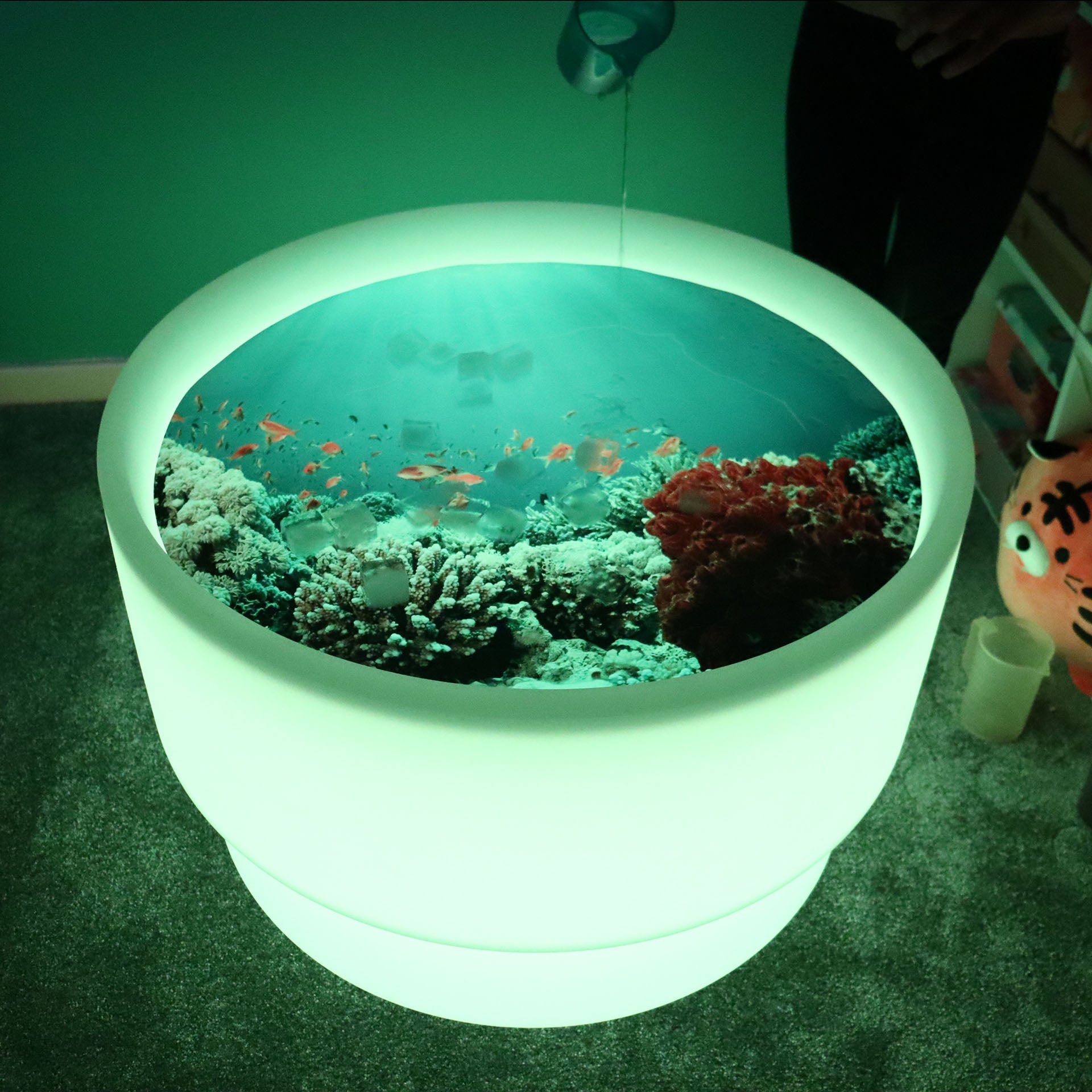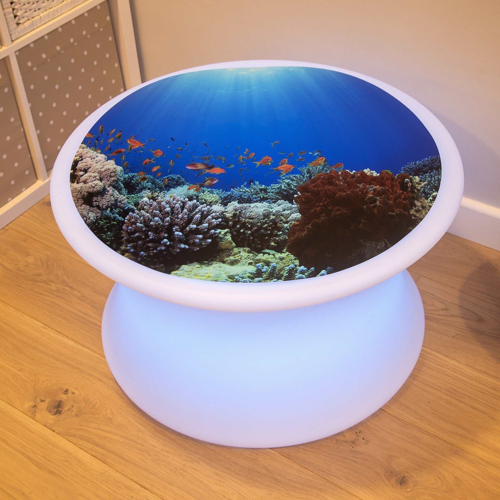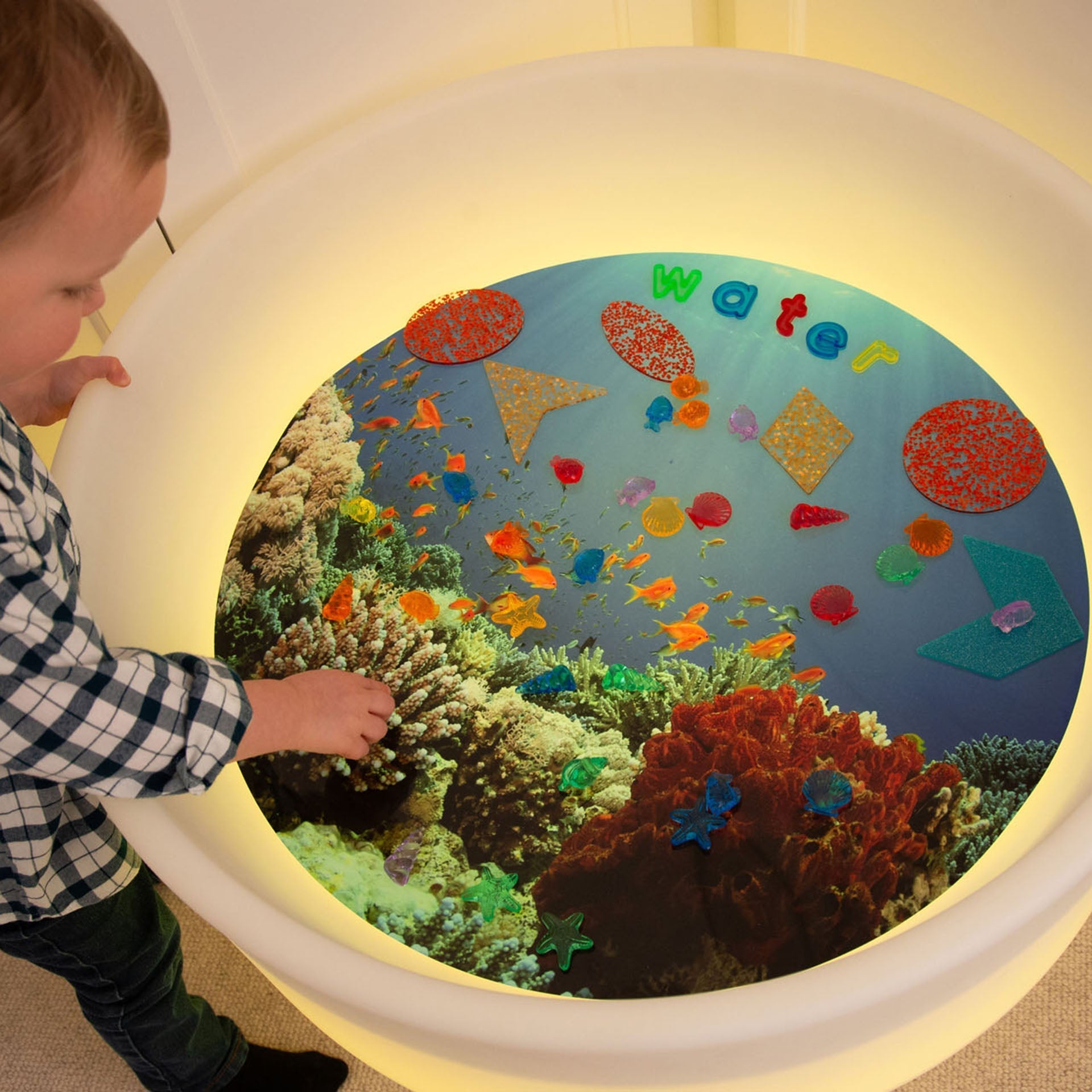 The semi-translucent qualities of the play mat make it ideal for use with a light panel or mood table, captivating your child's curiosity as the light illuminates the images. Different coloured light will intensify the colours of the images, making them more striking and engaging. A great way to explore colour as well as the ocean!