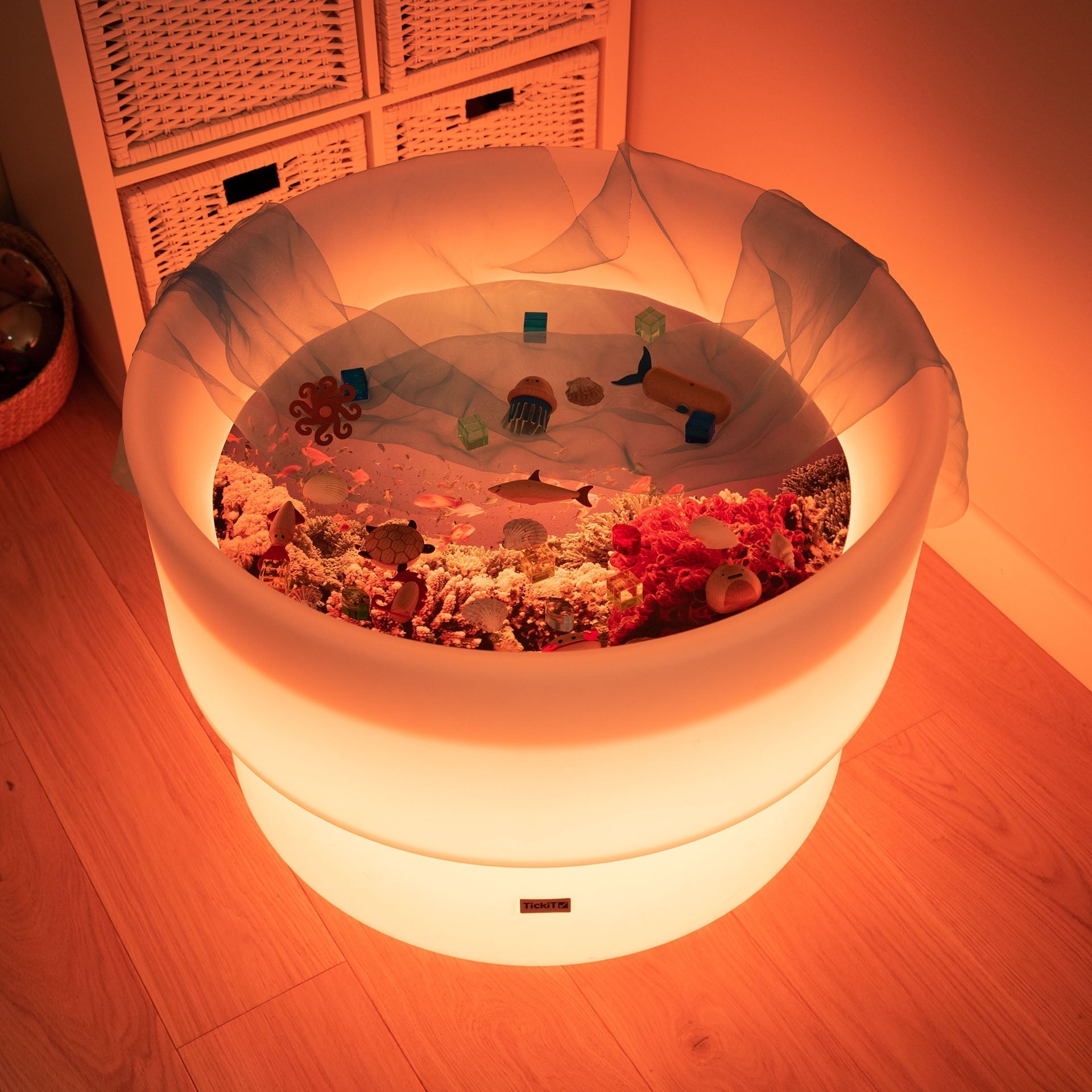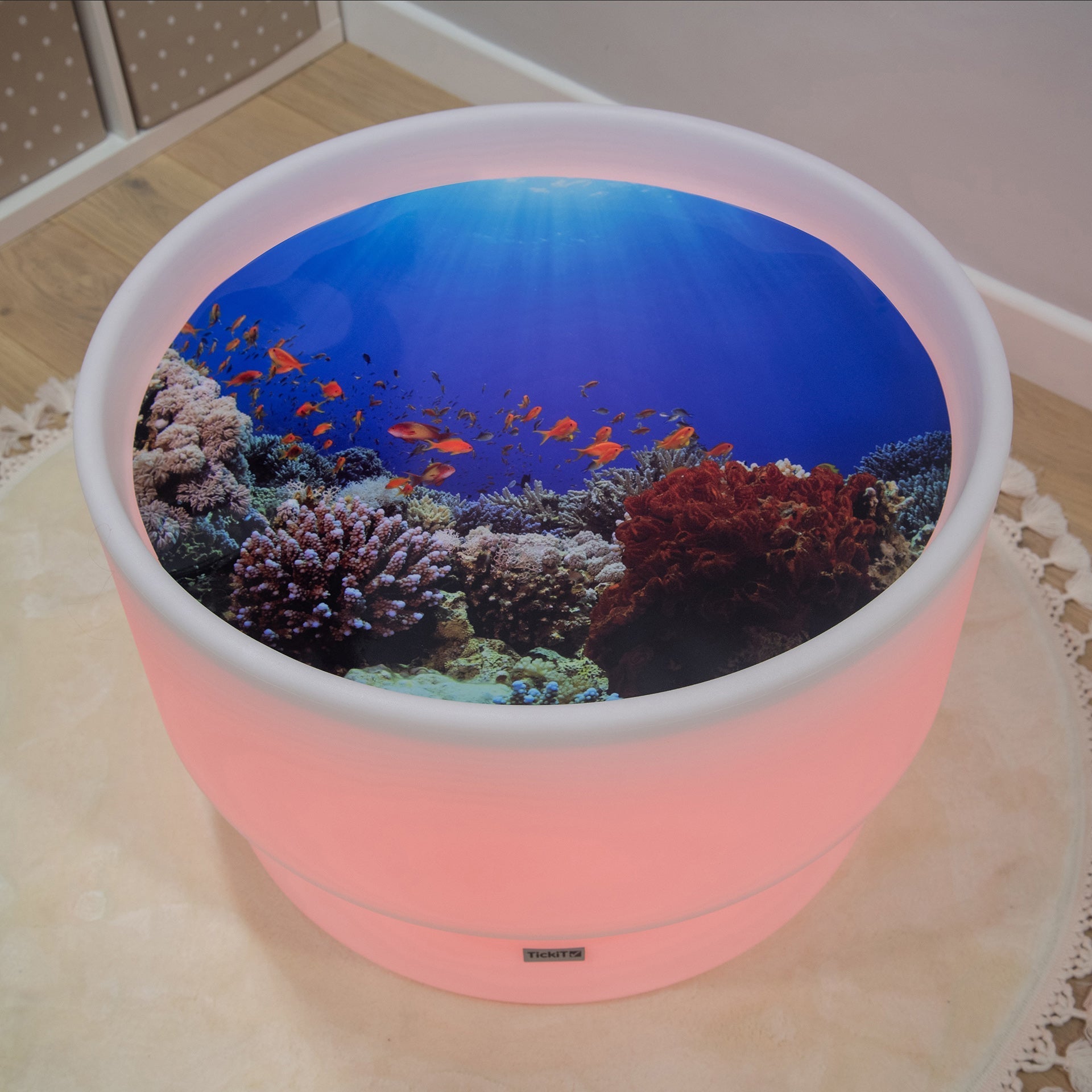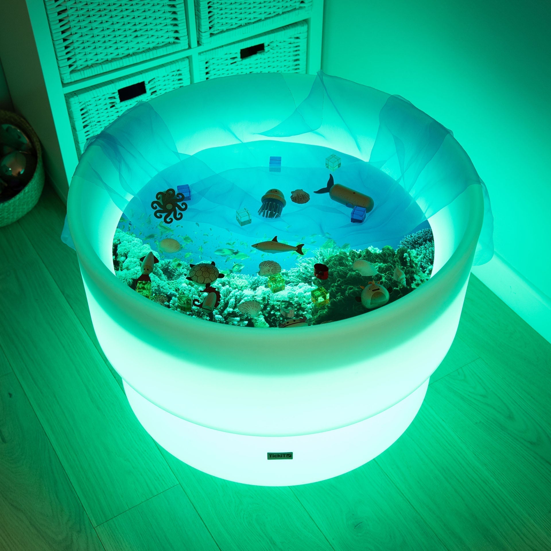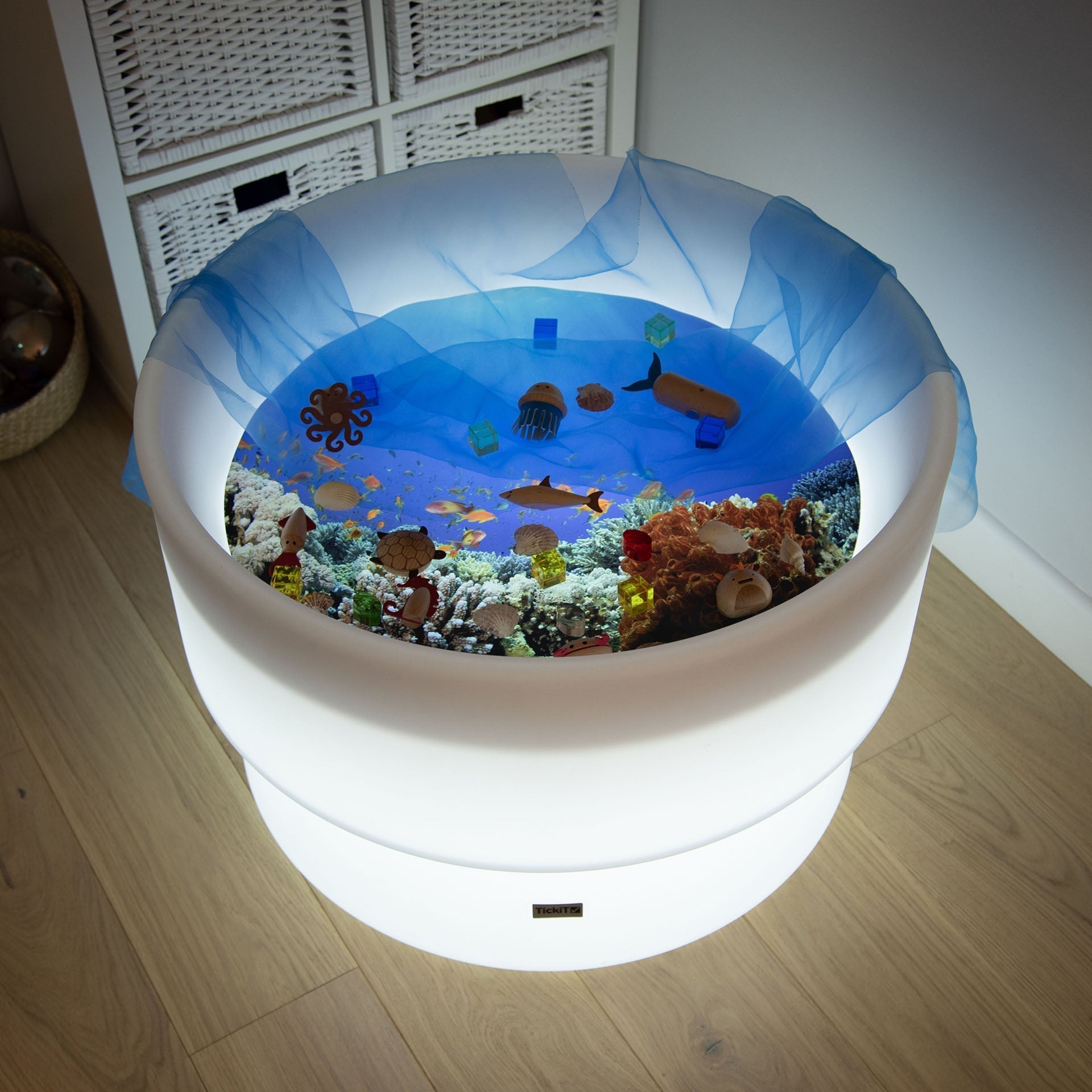 The tickit® Under The Sea Discovery Play Mat takes your child on a Sealife adventure through high definition imagery of coral reefs and tropical fish. There is no limit to the magic of their imagination as they journey beyond the ocean wave to discover the hidden depths of the sea.Designed to fit perfectly inside the tickit® Sensory Mood Discovery Table and tickit® Sensory Mood Water Table, it is ideal for small world play, sensory stimulation, imaginative play and encouraging descriptive vocabulary. Made from durable polyester it is robust and easy to clean.