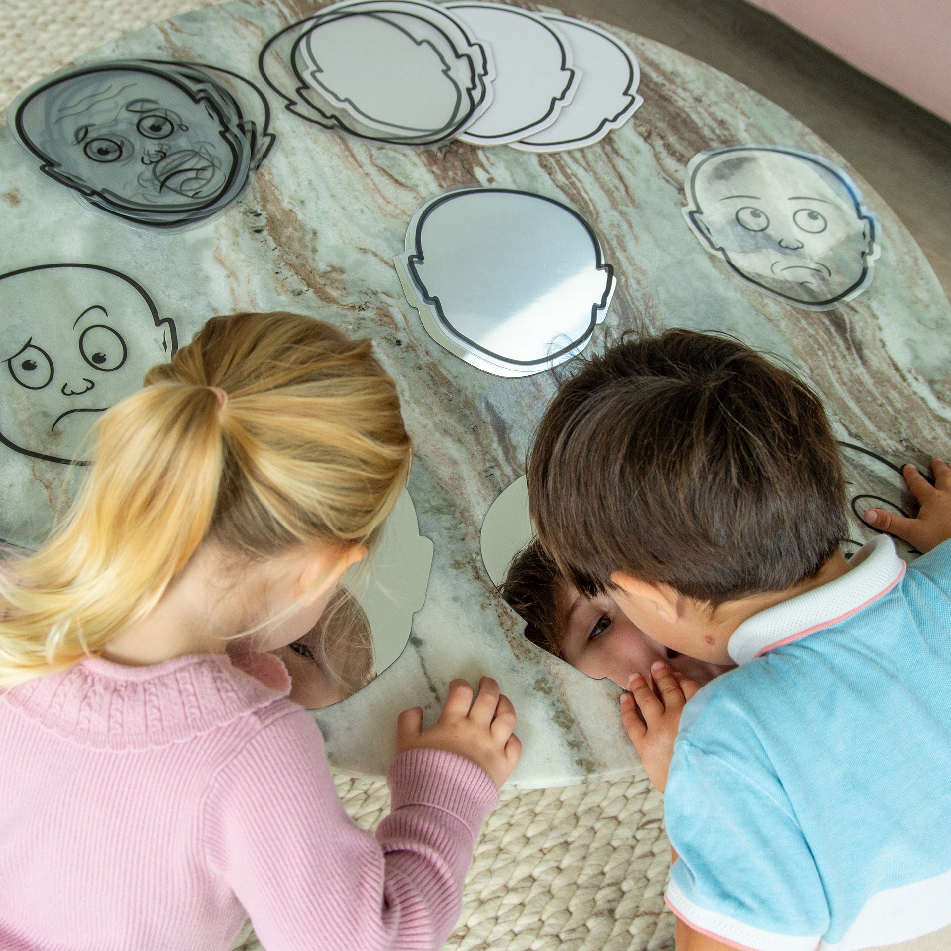 Set includes: 13 expression faces, 3 blank face-shaped boards, 3 blank face-shaped acetate sheets, 3 face-shaped mirrors, an A3 expressions poster and an activity guide.