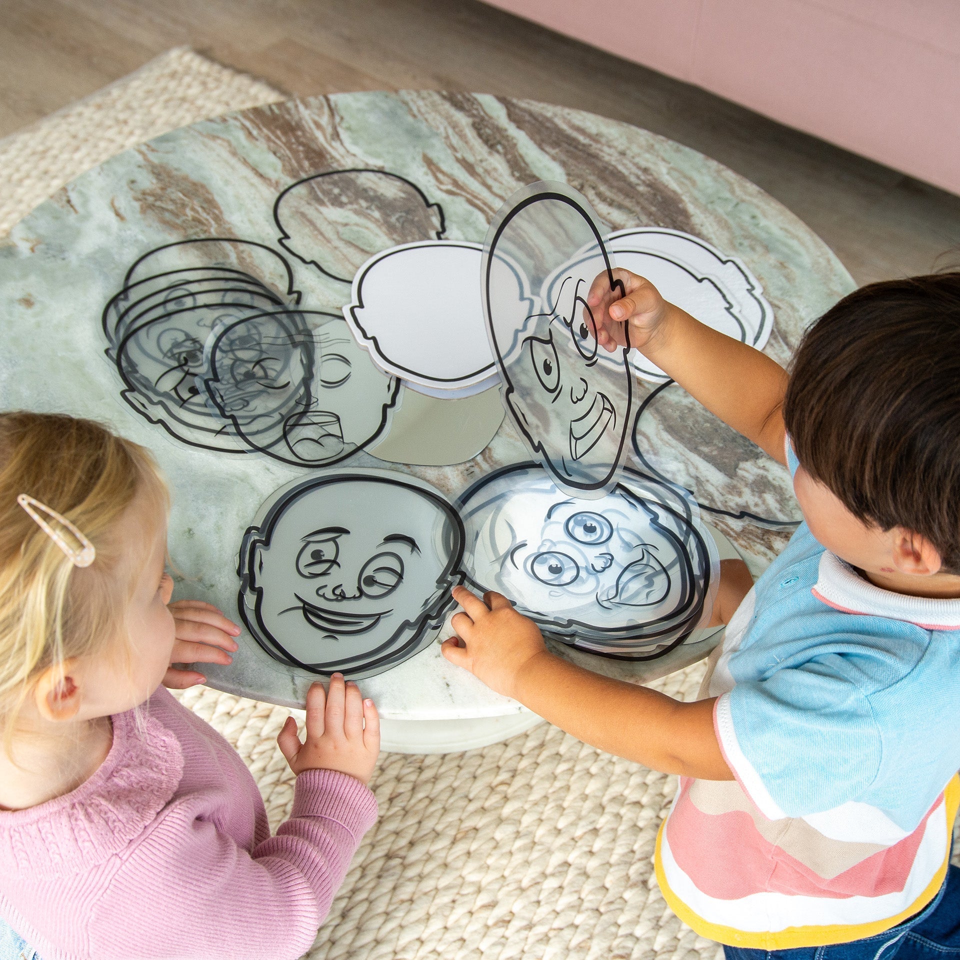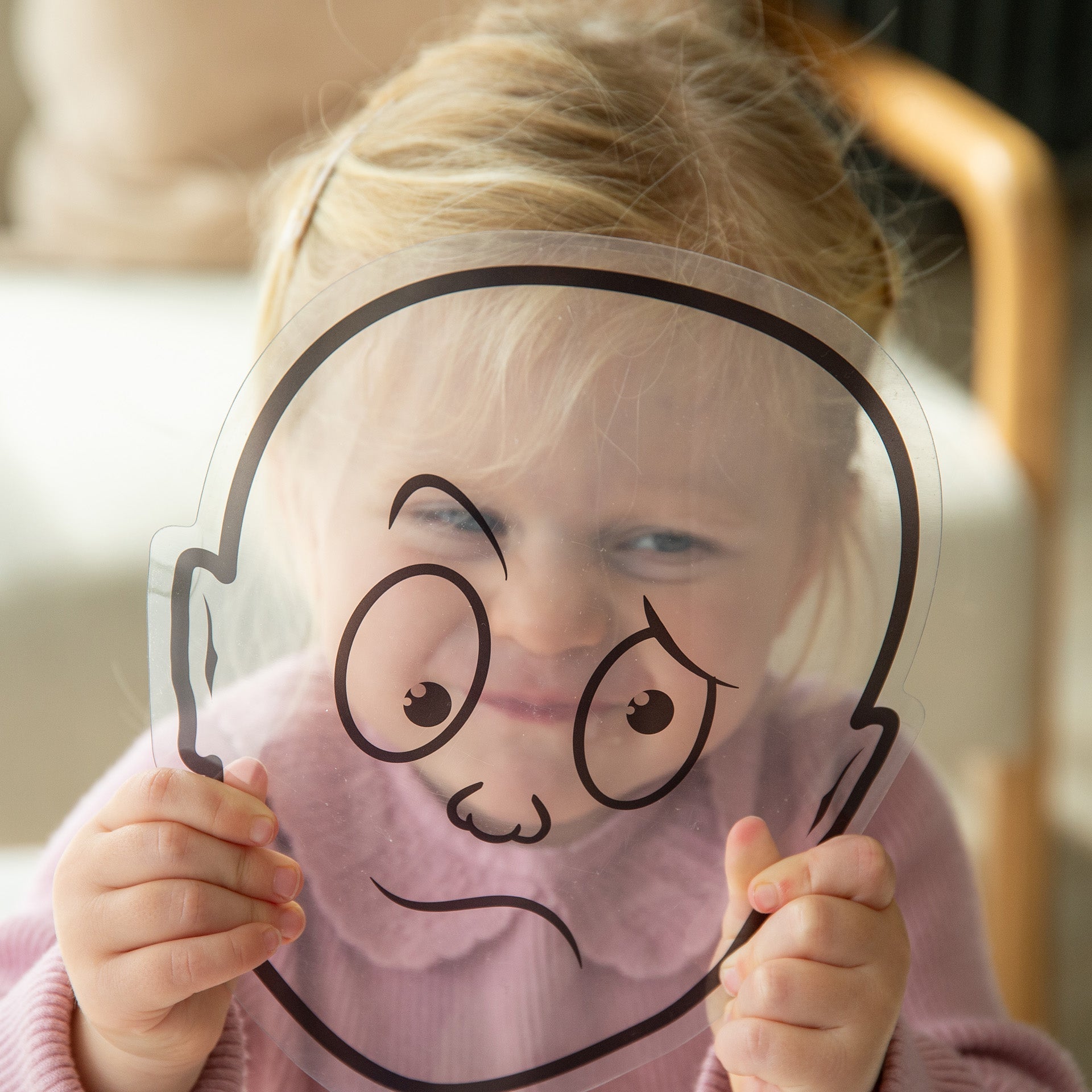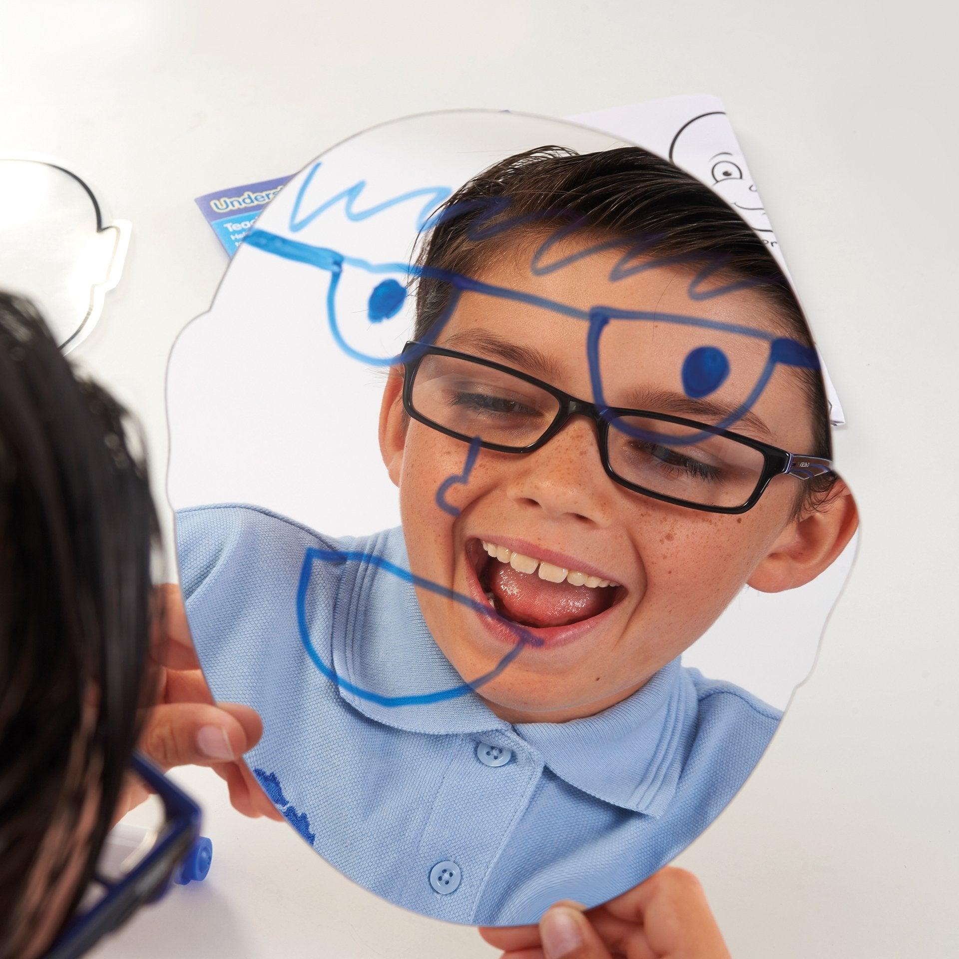 A range of different facial expressions are represented on clear plastic faces making them perfect to use with our range of light panels or against a window. The blank face-shaped boards and clear acetate sheets can be used with dry wipe makers for children to draw their own or other people's expressions, and the face-shaped mirrors are great for observing self-expression. Using the set enables children to learn to communicate and discuss their own emotions better and understand how others around them might be feeling.