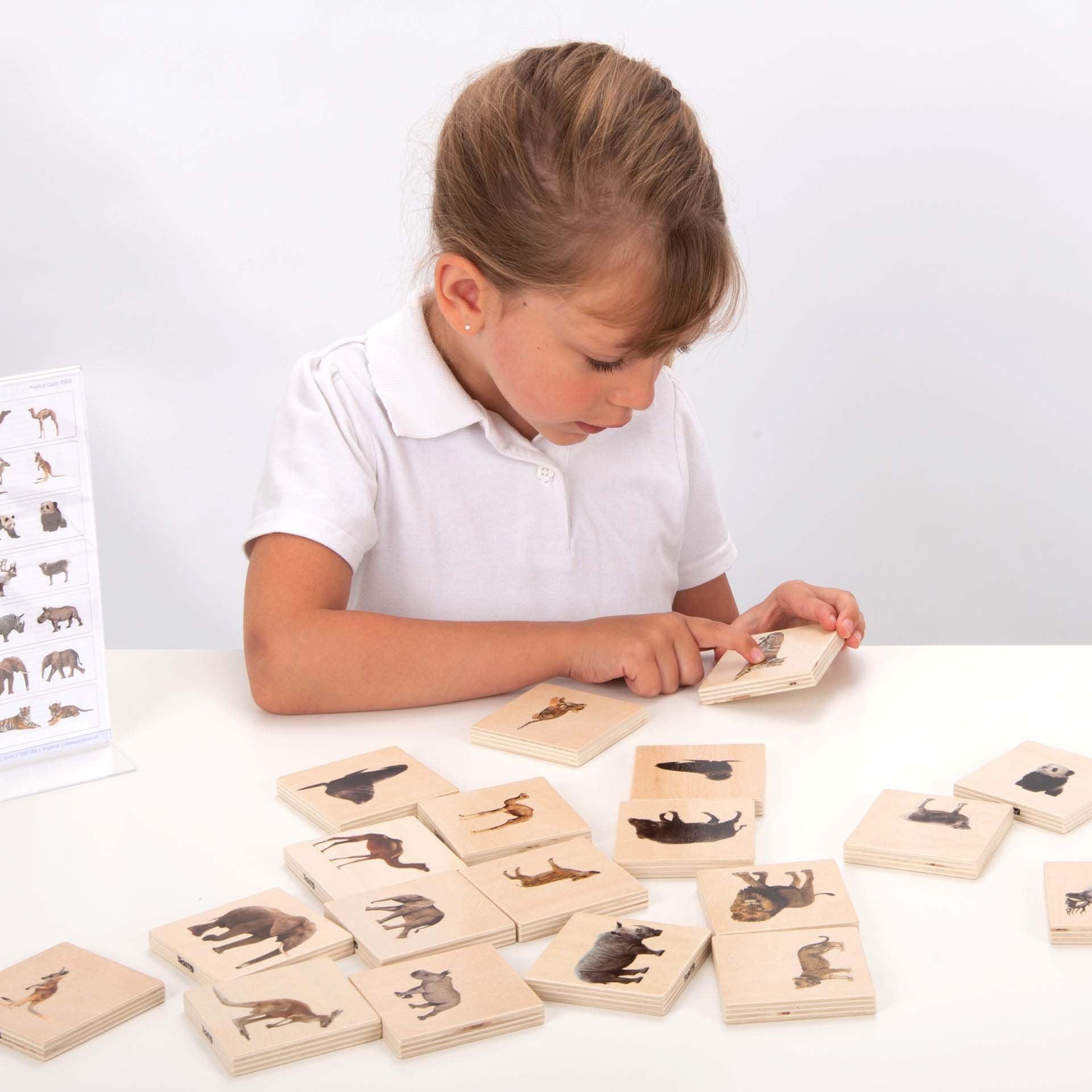 A fun and versatile wooden game, our tickit® Wild Animal Family Match is a set of fourteen pairs of smooth tactile basswood ply tiles with a clear colour print on one side of real photographic images of adult wild animals and their young. The square chunky tiles are easy for your child to hold and turn over in their hands.