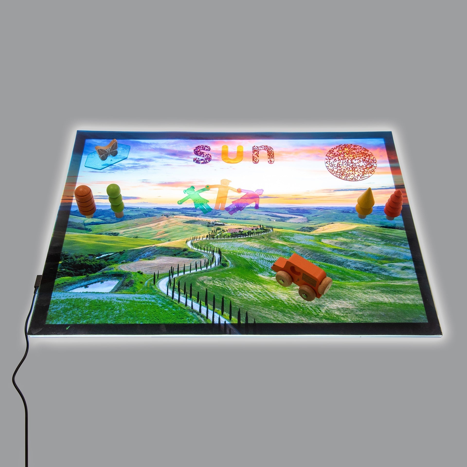 Designed to perfectly fit our A2 Light Panel, this play mat takes on a whole new level of enchantment when illuminated. Its semi-translucent properties allow the light to shine through, bringing the scene to life with a mesmerising glow. Depending on the colour you choose, you'll experience a variety of effects—some colours may intensify, while others might appear to fluoresce, adding excitement to playtime.