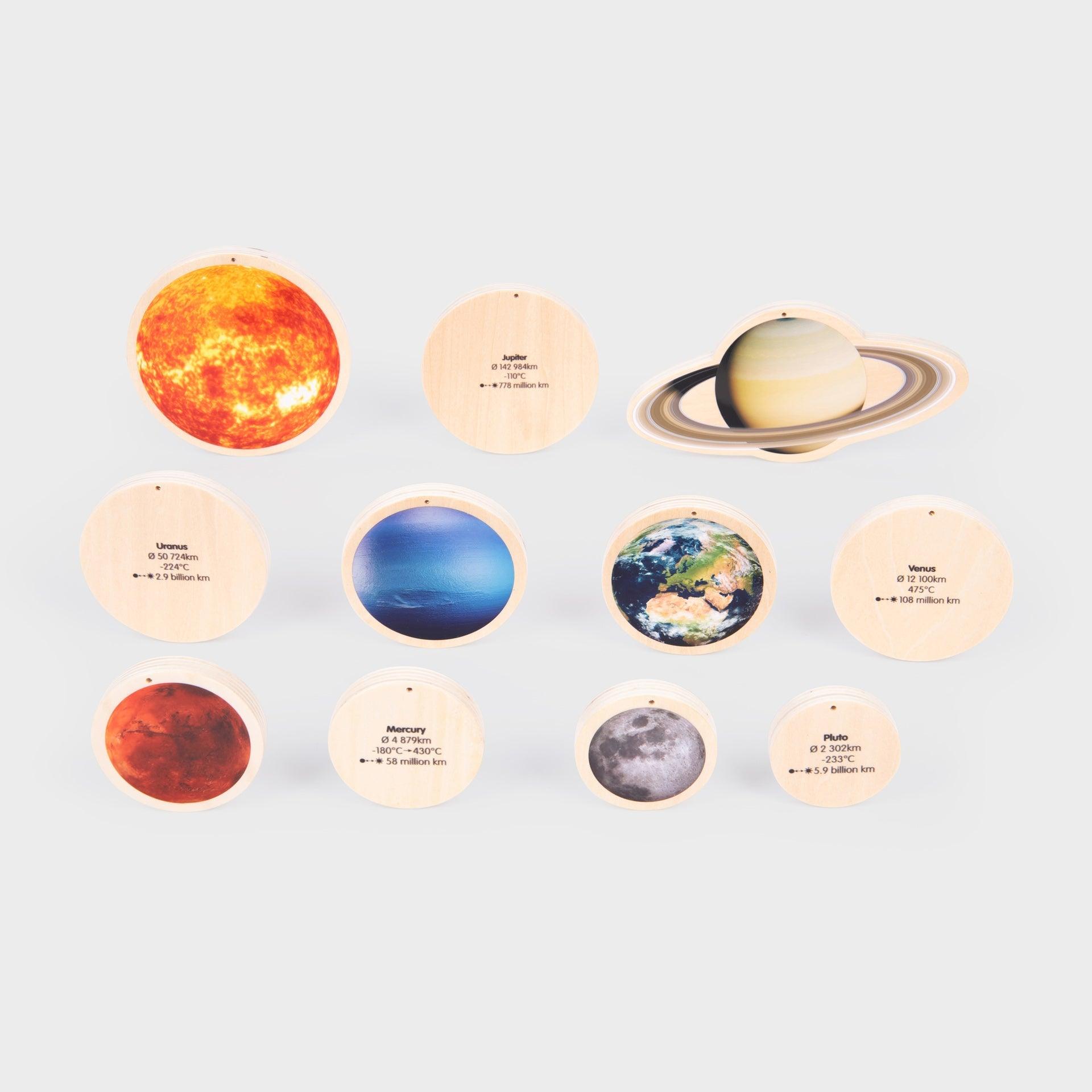 Comes with a beautiful colour printed solar system poster and a colour guide with interesting facts. Wooden discs include: The Sun, Jupiter, Saturn, Uranus, Neptune, Earth, Venus, Mars, Mercury, Earth's Moon & Pluto.