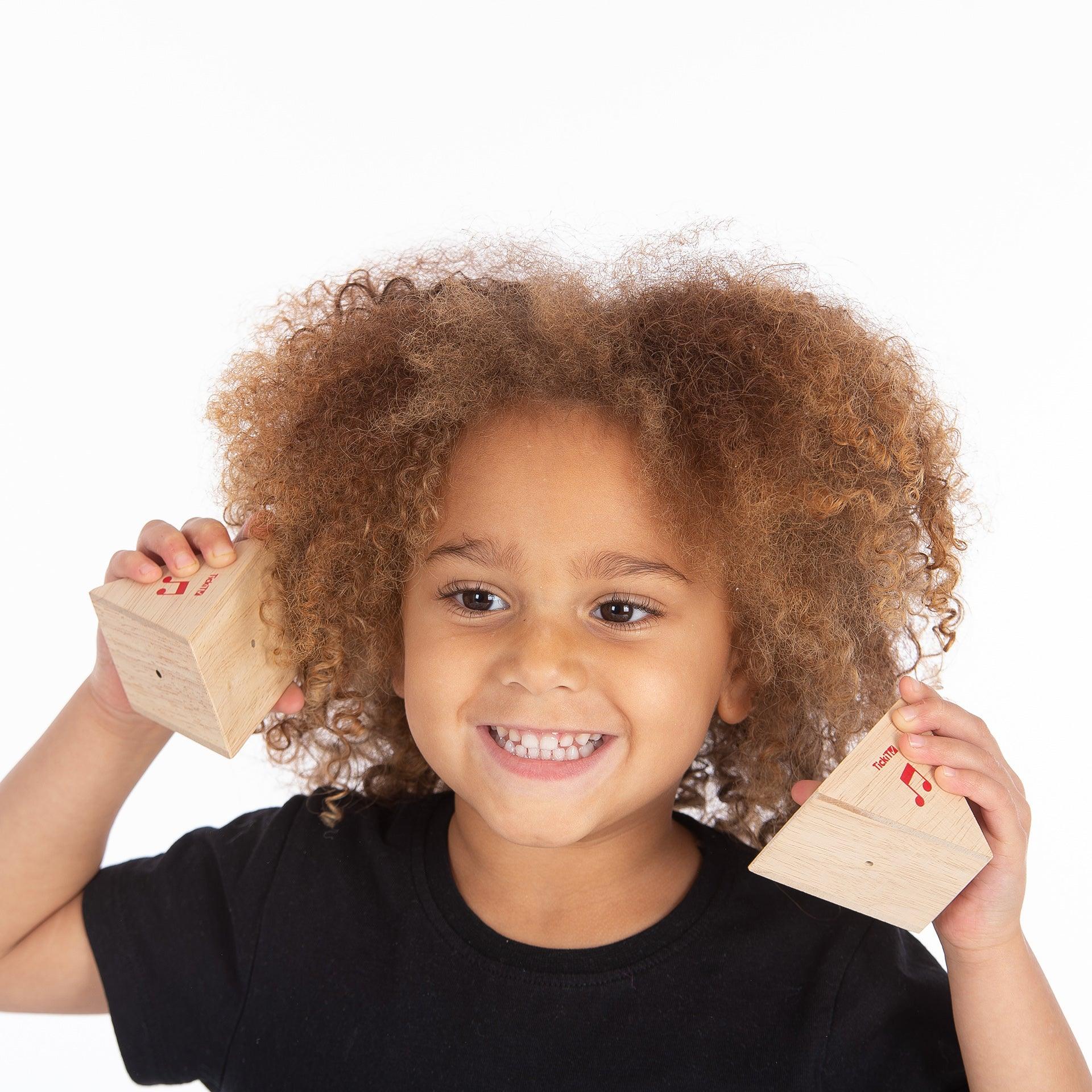 The tickit® Wooden Sound Prism Set contains six pairs of beautiful wooden triangular prisms. Each hardwood prism has a coloured musical note logo that only appears on one end of the block, so it can be turned upside down for your child to explore which blocks make different sounds and learn to match in pairs. A great game to play with your child to encourage sound discovery and language skills.